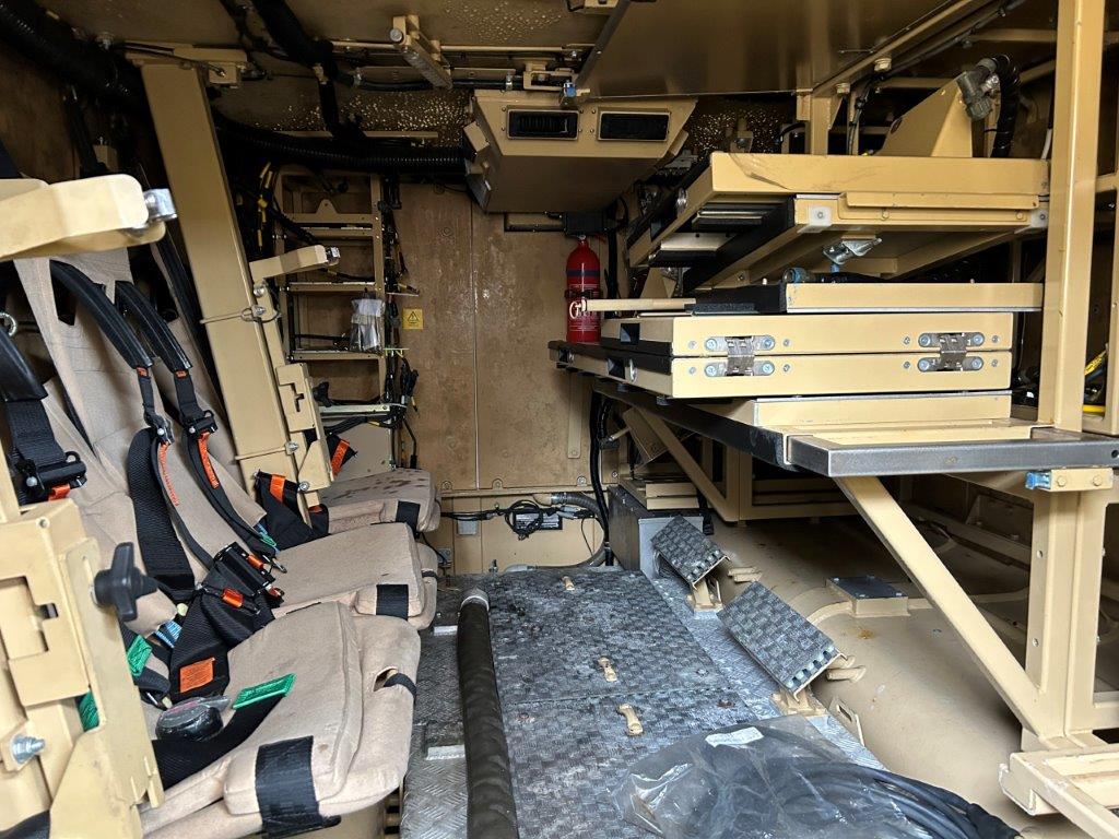 The front module of Command Variant (CV) have the same configuration as the troop carrier variant (TCV) with same number of crew. In the rear cabin there are four crew seats on the left side while on the right side is fitted with a sliding table and map board. A lightweight field generator is fitted capable of producing 2Kw of continuous power.