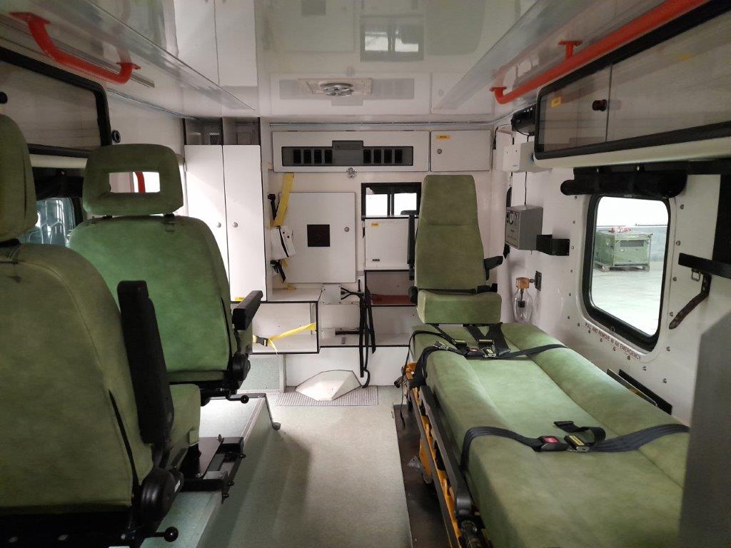The ambulance body compartment is at the rear and is set out for a single stretcher and up to three attending medics with plenty of storage space as well as being piped for oxygen supply